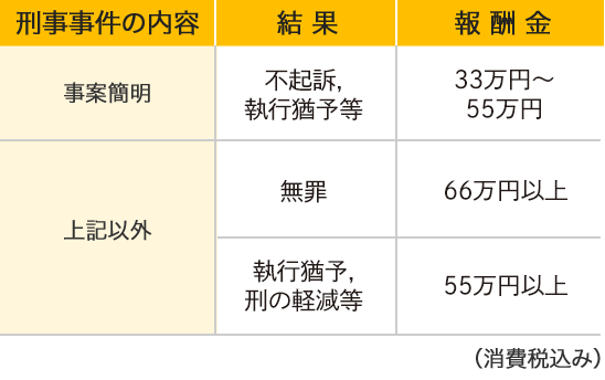一般の刑事事件は次の表に準拠しますが,具体的には担当弁護士にご相談下さい。