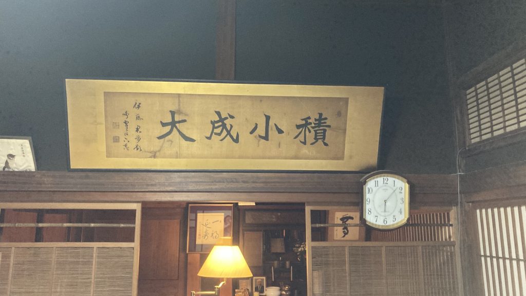この扁額は日本の漢字教育において革命的な役割を果たした日下部鳴鶴の筆によるものです。これは大体明治33年頃の作だと思われます。 どこが革命的なのか、日下部鳴鶴は彦根藩で藩校の校長を務めていた人であるが、明治初め東京に移り、書道の研究に入った。当時の日本は、鎌倉時代の初めから明治の初め頃まで、公用書体は「御家流」という崩し字を使ってきたが、一種のスタンプのように文字を書くので、そこには書道芸術が成立する余地はなかった。